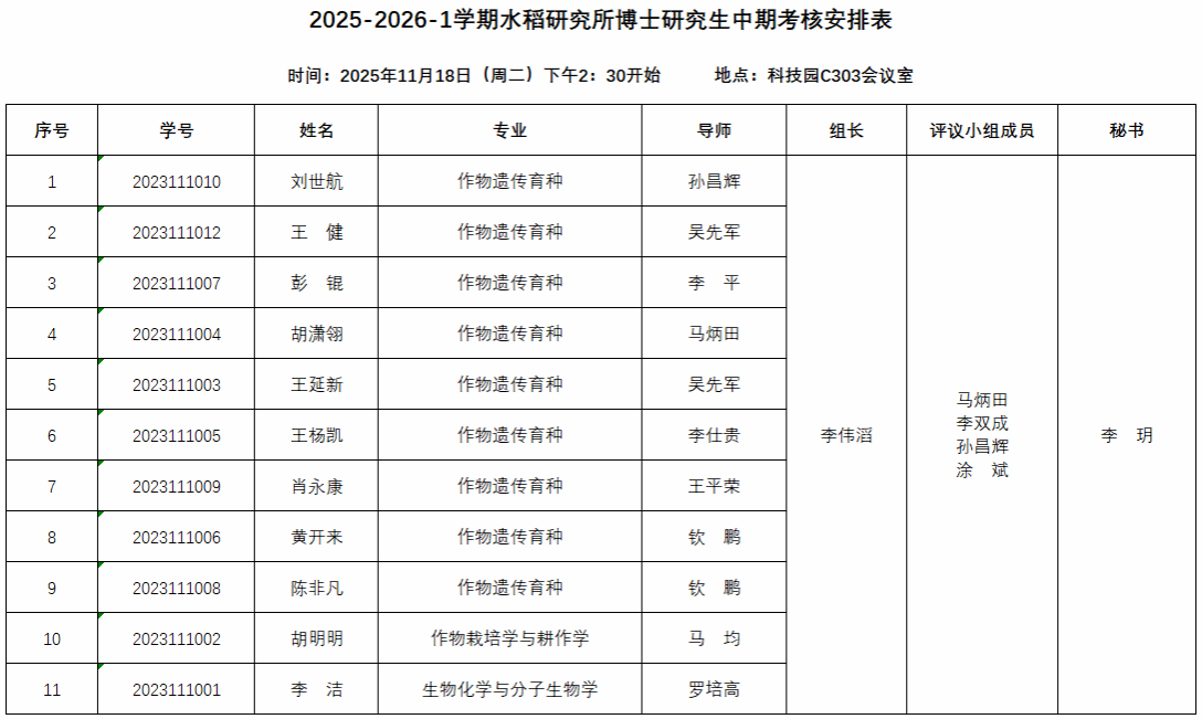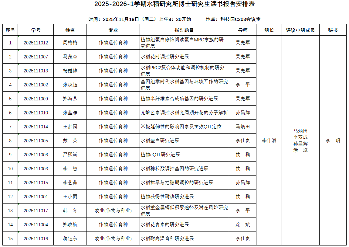 2025-2026-1学期水稻所博士研究生读书报告、中期考核安排表