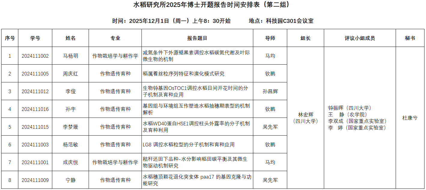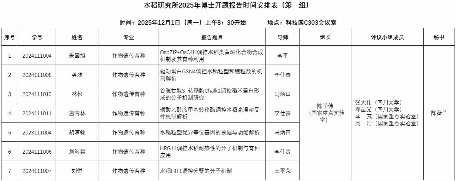 水稻研究所2025年博士开题报告时间安排