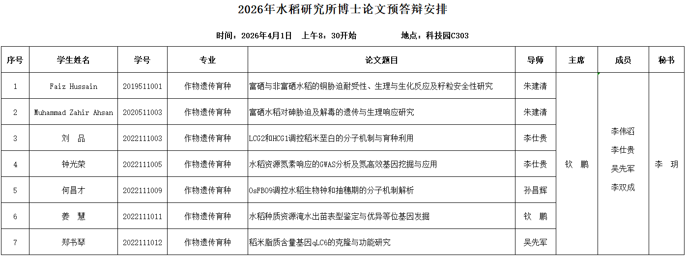 2026年水稻研究所博士论文预答辩安排