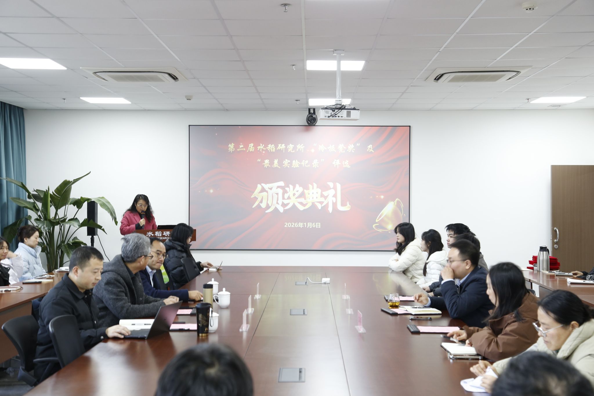 1月6日上午,颁奖仪式在水稻研究所科技园C303会议室举行。所长钦鹏、党委书记庄萍萍、副所长兼党委副书记李伟滔及相关师生代表出席。四川台沃种业有限责任公司总经理雷全红、副总经理余泓洁,四川杰莱美科技有限公司常务副总曾正奎作为捐赠单位代表应邀参加。